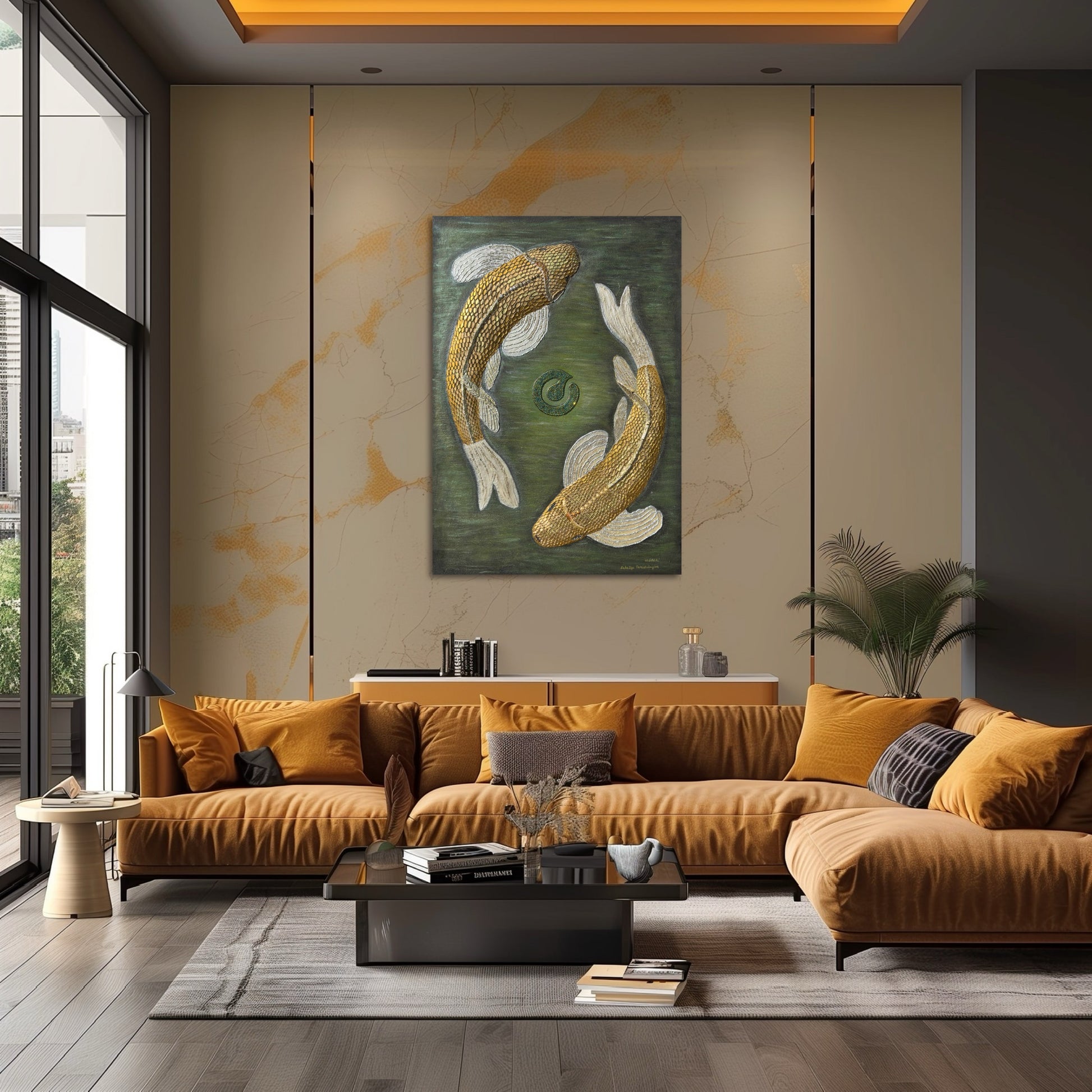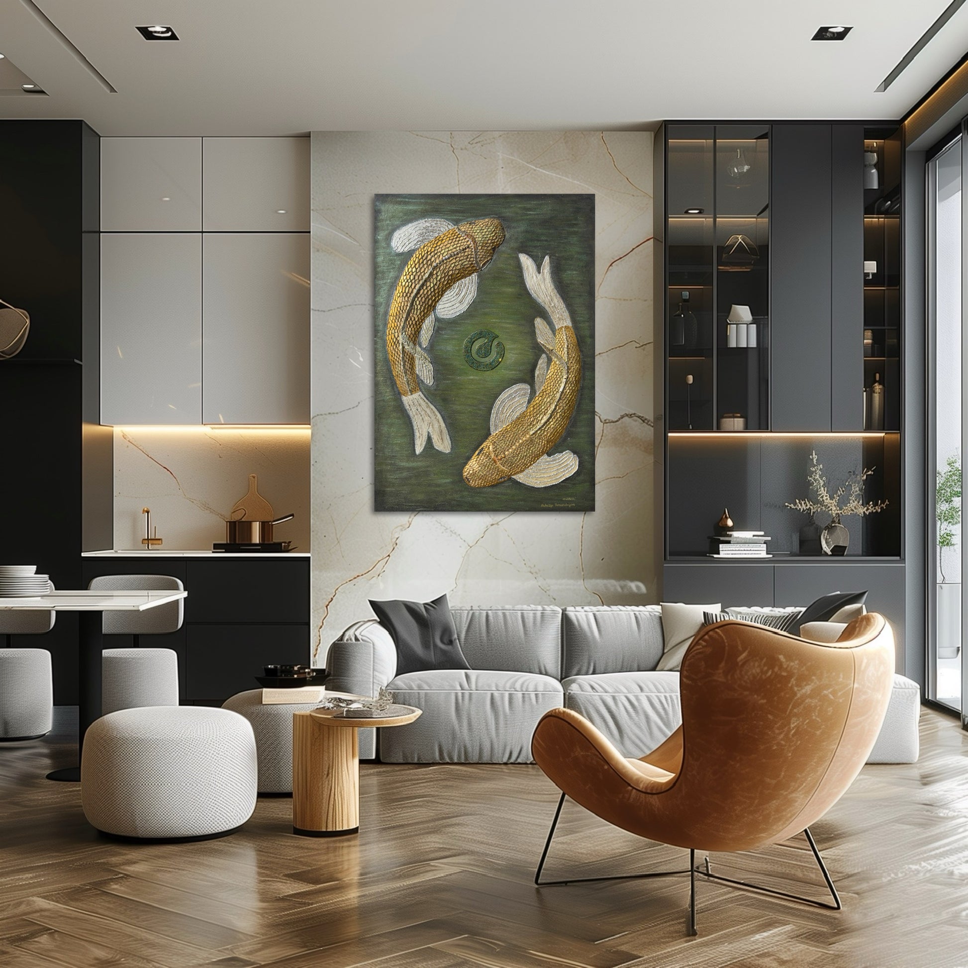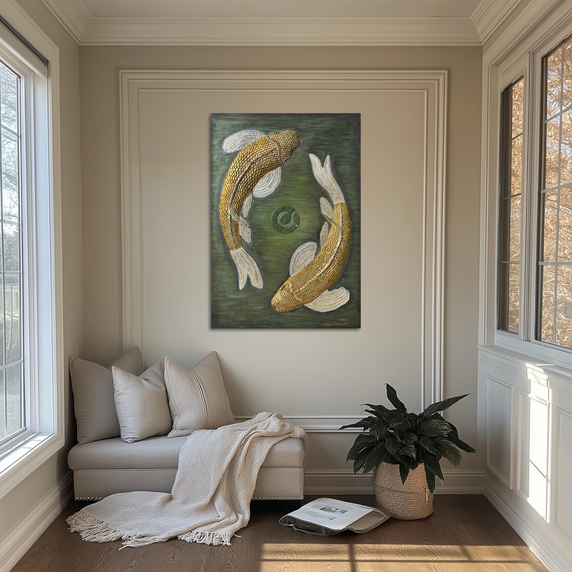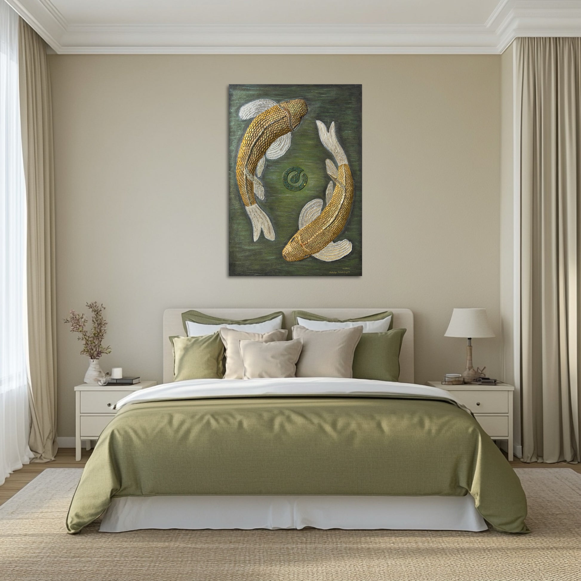 Two magnificent koi fish, adorned in shimmering gold leaf, glide effortlessly through a deep, textured green background. Their sculpted scales—each one a meticulous stroke of artisanal craftsmanship—catch the light, creating a hypnotic interplay of shadow and brilliance. Every detail, from the delicately contoured fins to the precisely embedded processed glass shards in their eyes, breathes life into this exceptional artwork.