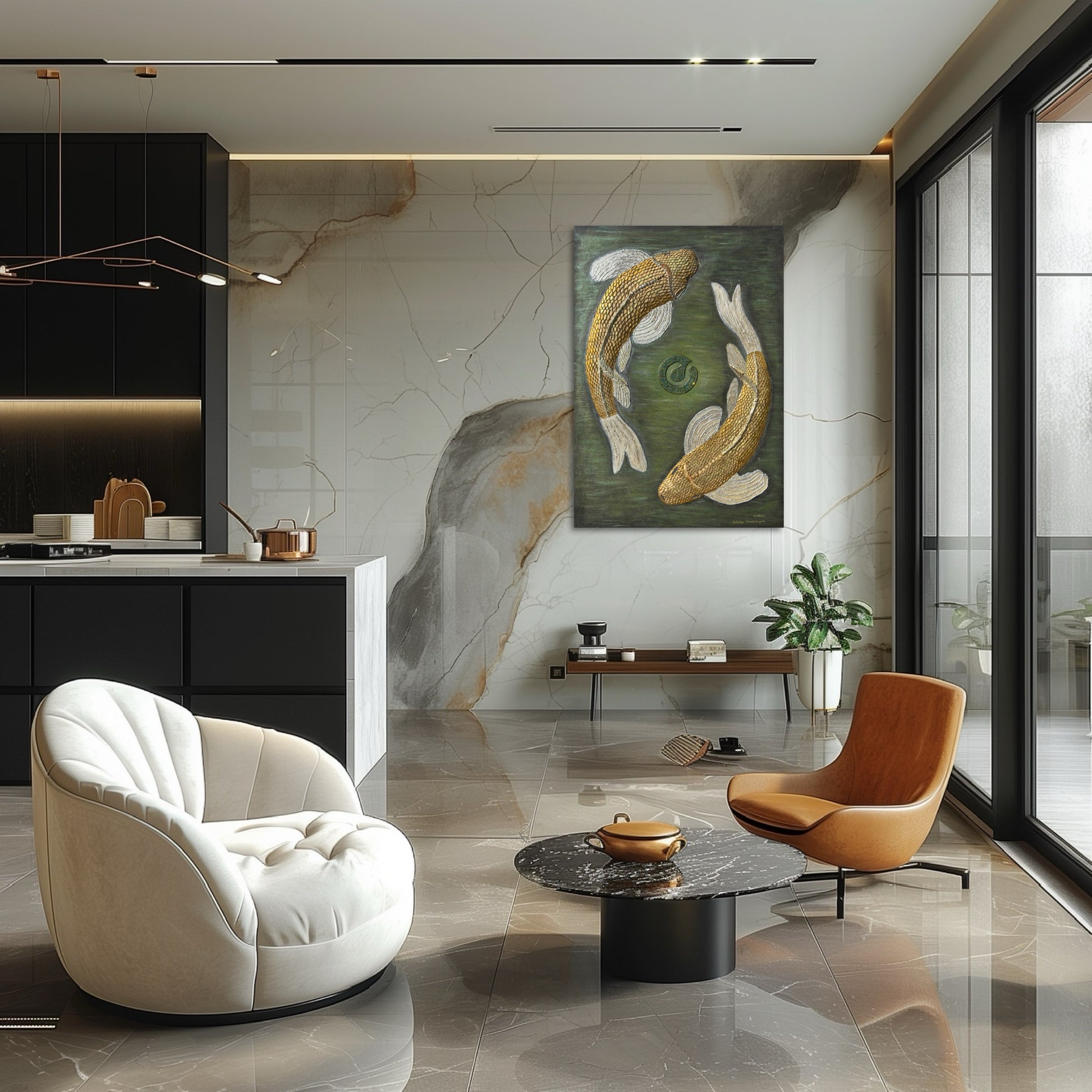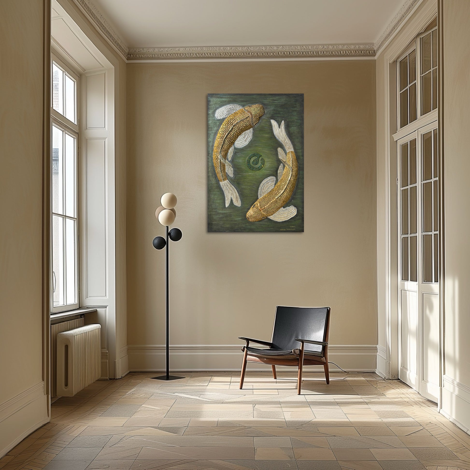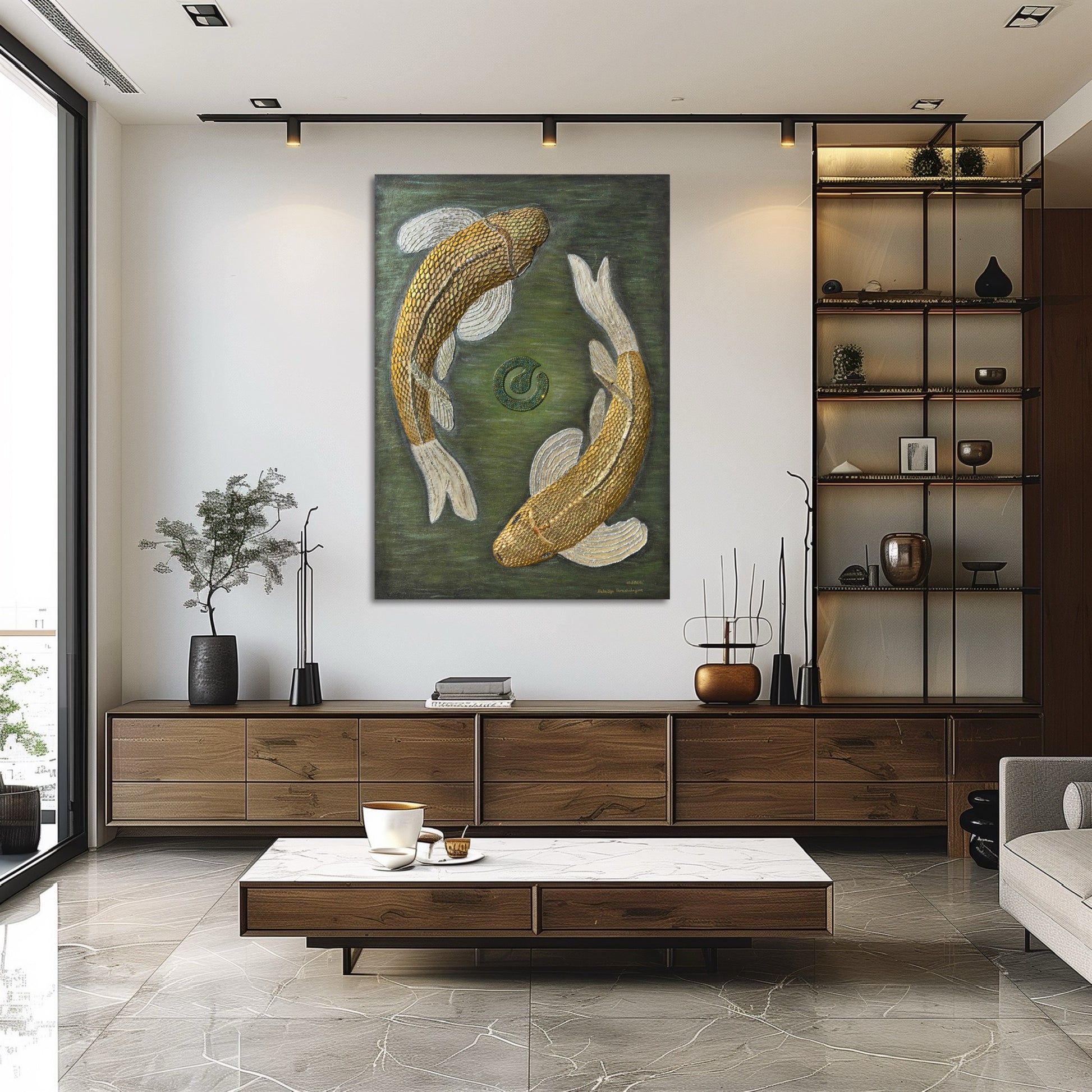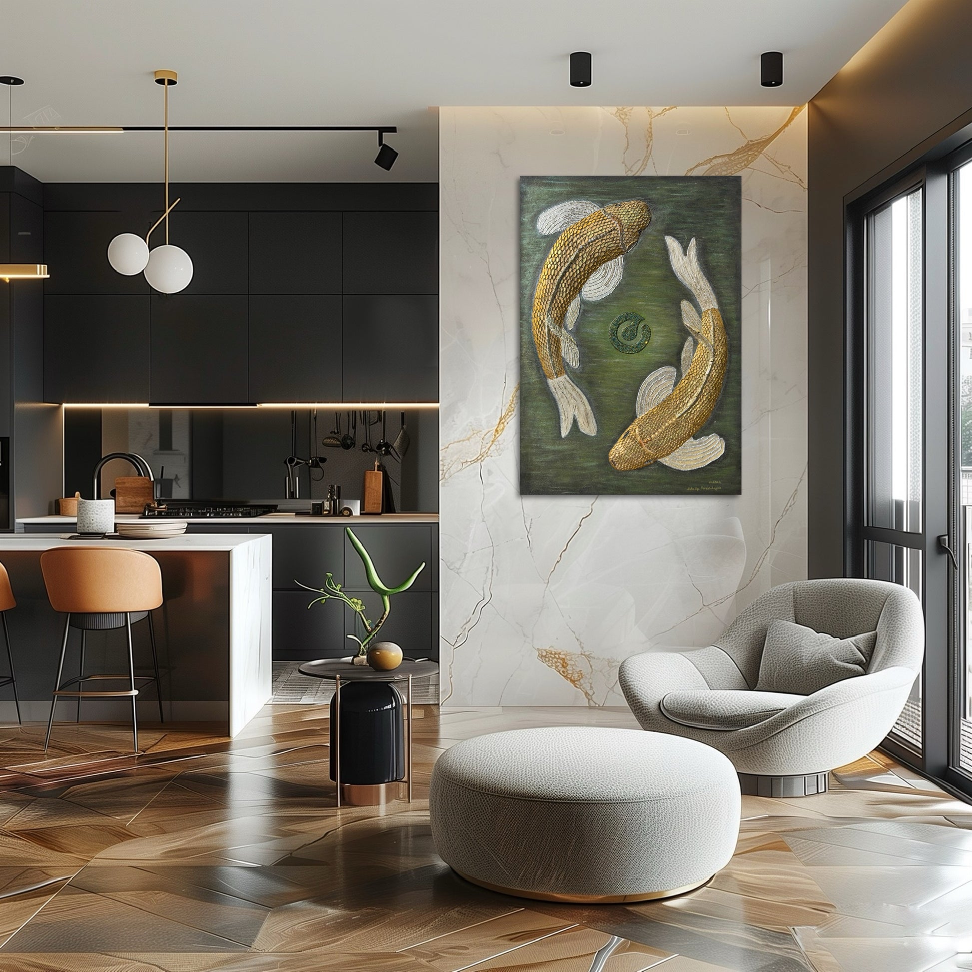 Two magnificent koi fish, adorned in shimmering gold leaf, glide effortlessly through a deep, textured green background. Their sculpted scales—each one a meticulous stroke of artisanal craftsmanship—catch the light, creating a hypnotic interplay of shadow and brilliance. Every detail, from the delicately contoured fins to the precisely embedded processed glass shards in their eyes, breathes life into this exceptional artwork.